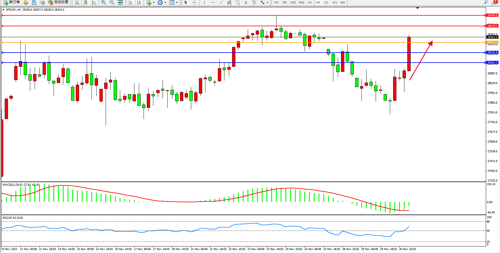 日经指数JPN225——4小时K线图显示: