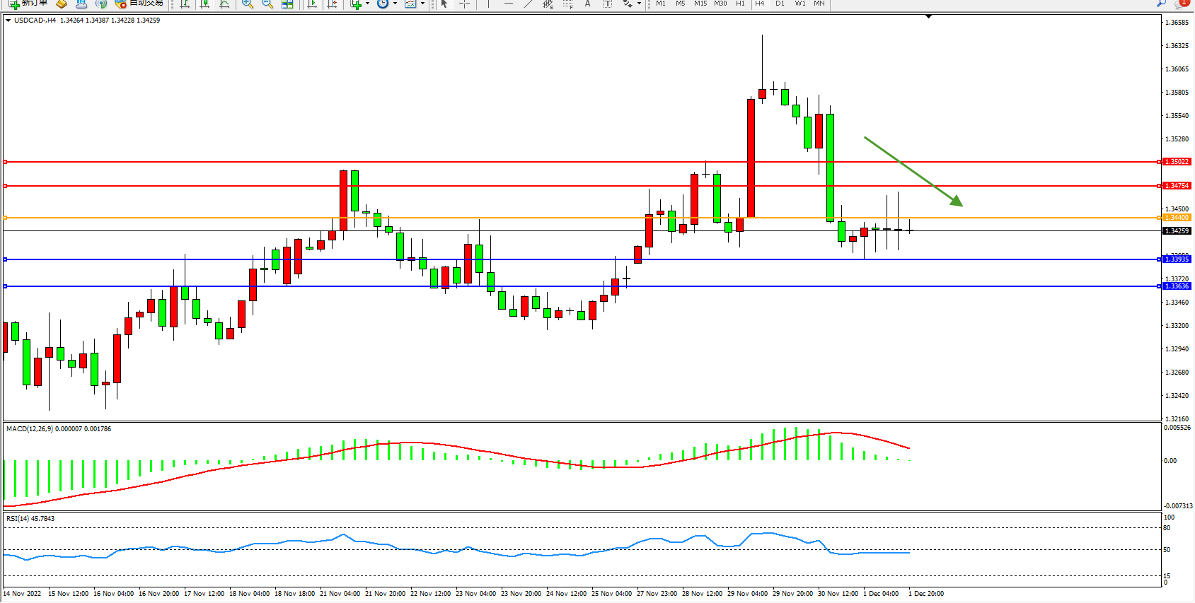 美元加元USDCAD——4小时K线图显示: