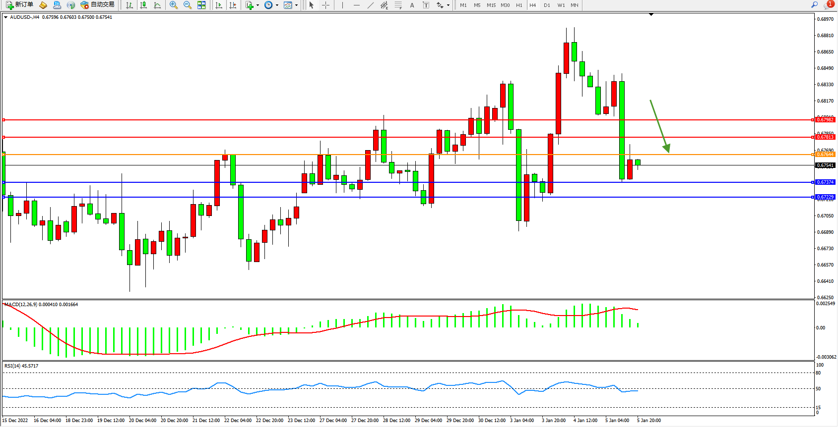 交易策略:0.67644下方看跌,目标0.67374、0.67229