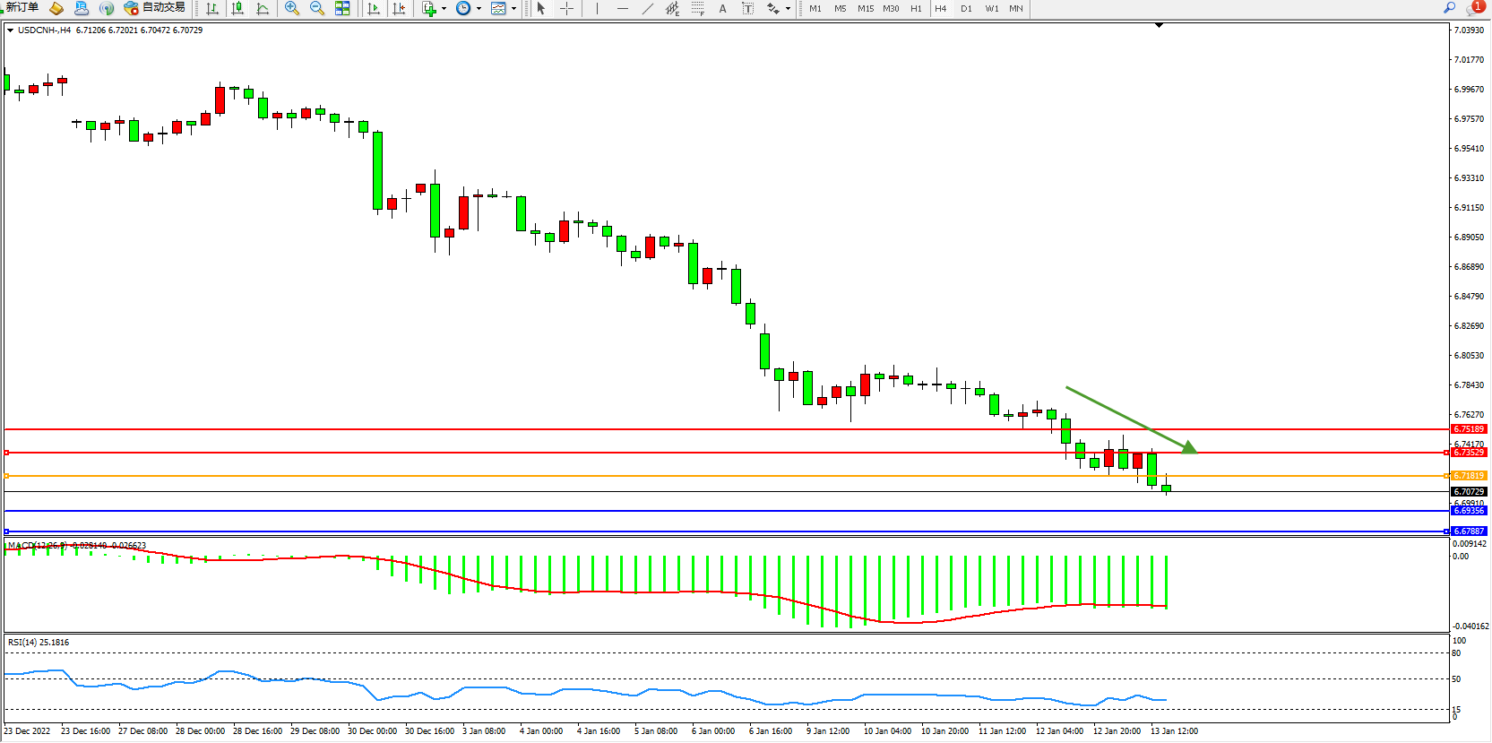 美元人民币USDCNH——4小时K线图显示:
