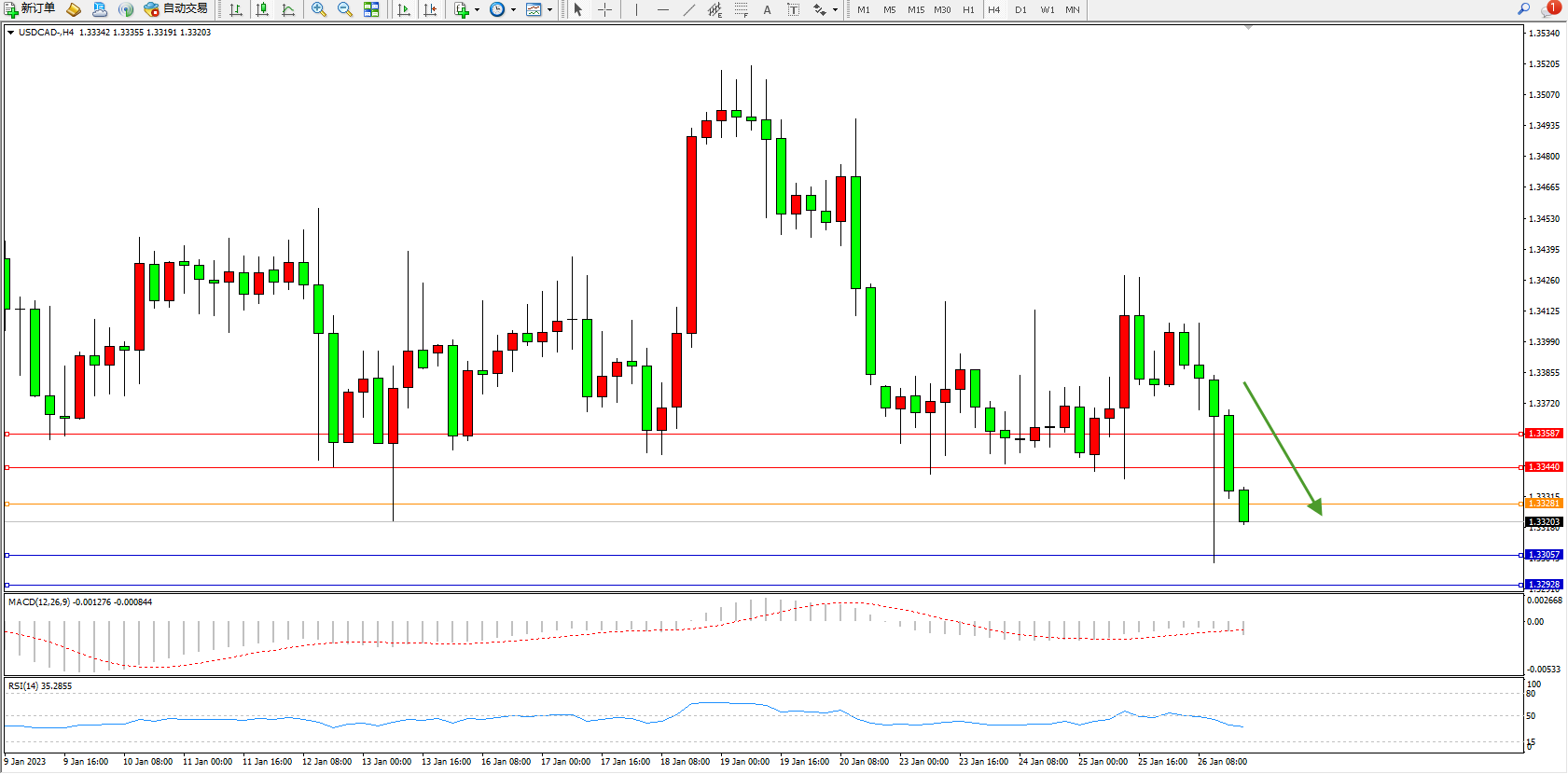 美元加元USDCAD——4小时K线图显示: