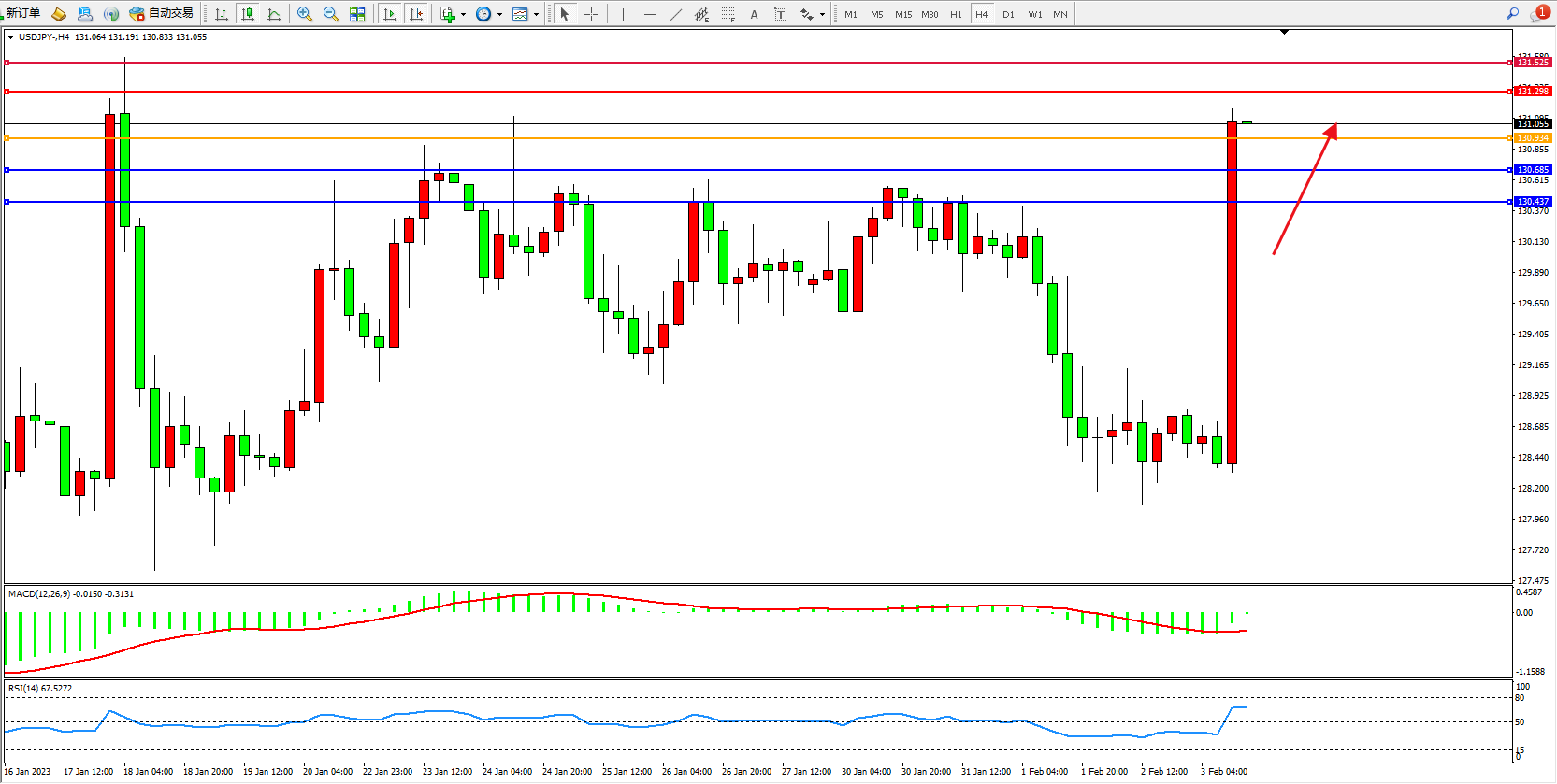 交易策略:130.934上方看涨,目标131.298、131.525