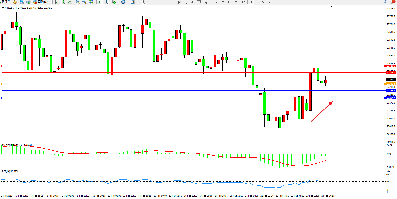 日经指数JPN225——4小时K线图显示: