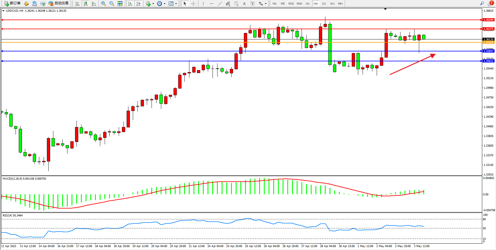 美元加元USDCAD——4小时K线图显示: