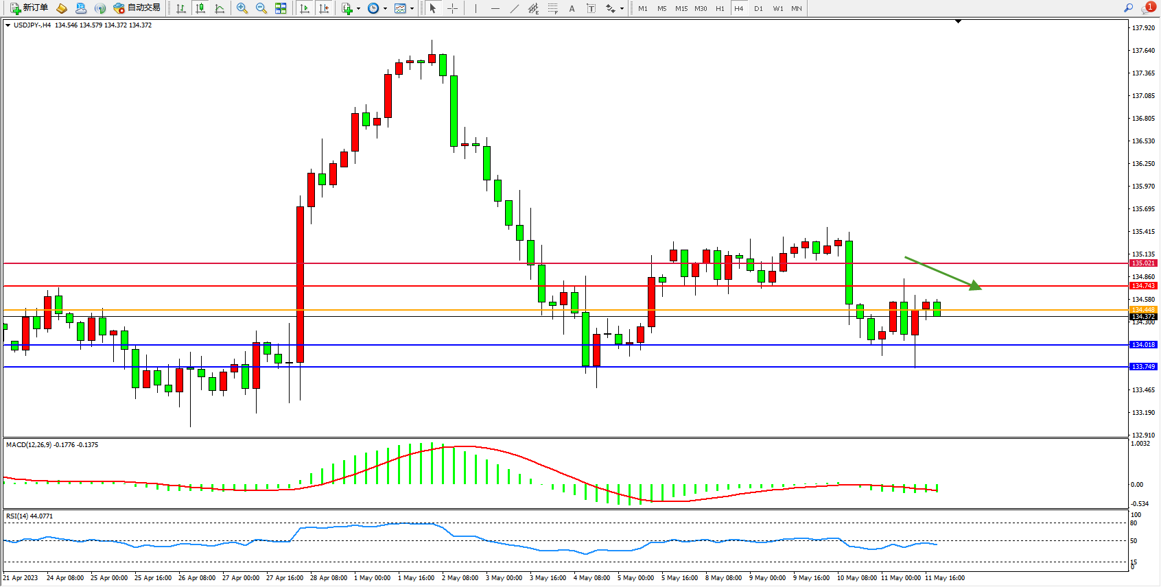 交易策略:134.372下方看跌,目标134.018 133.749