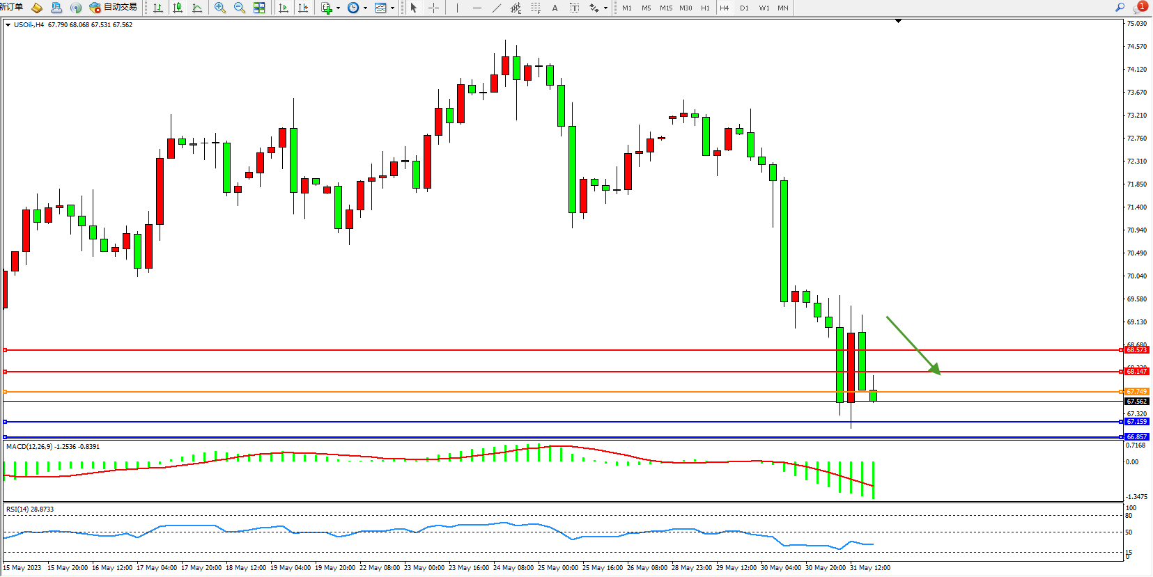 交易策略:67.749下方看跌,目标67.159  68.857