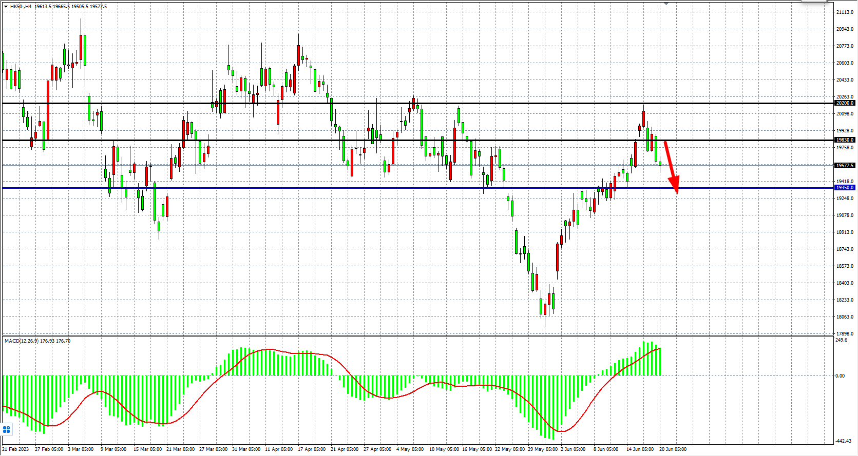 4小时图看,恒指跌破19800,MACD量能在零轴上小幅缩量,行情进入调整,当前支撑关注19350附近,阻力19830-20200。