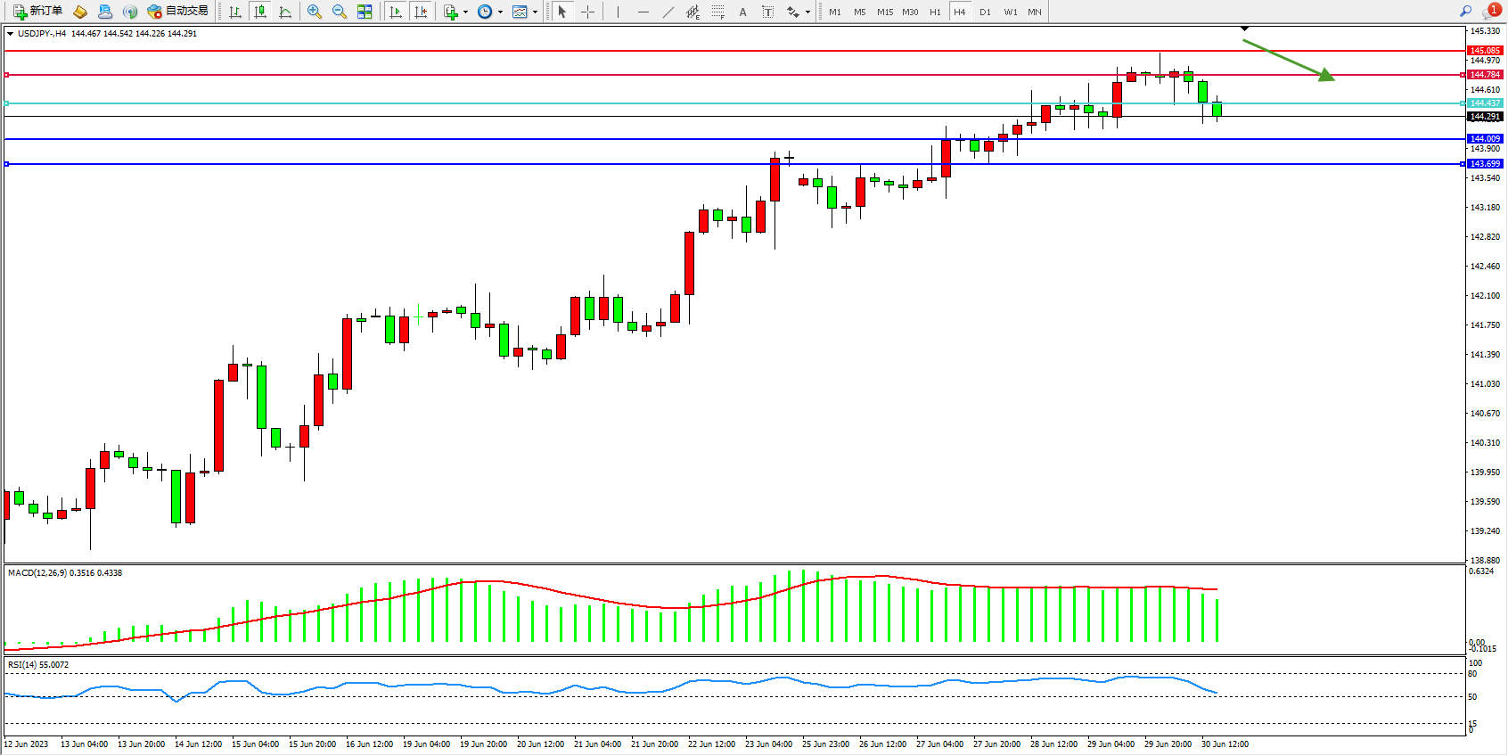 交易策略:144.437下方看跌,目标144.009 143.699