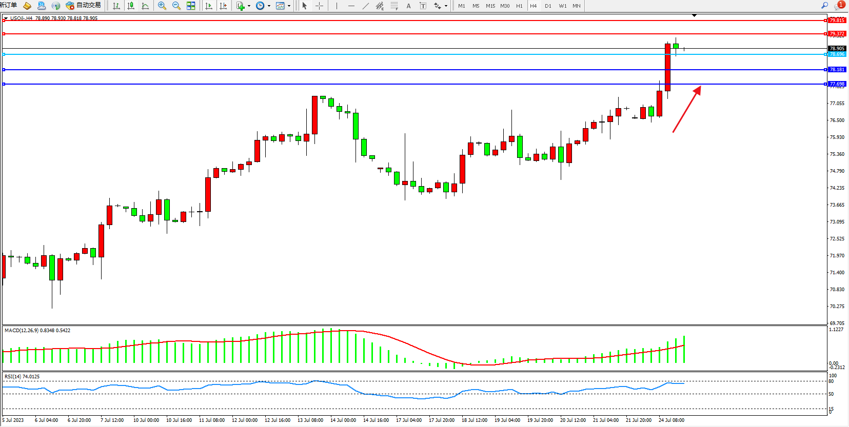 原油USOil——4小时K线图显示: