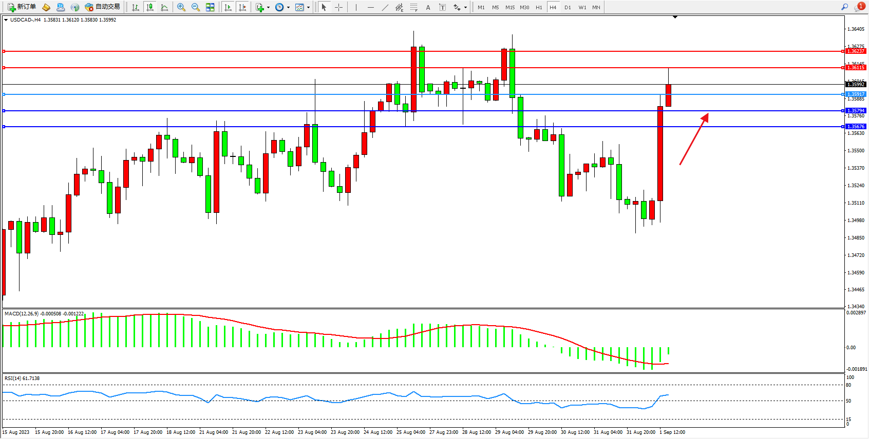 美元加元USDCAD——4小时K线图显示: