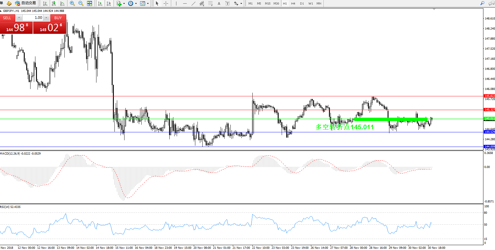 备选策略:在145.011下方看空,目标144.009