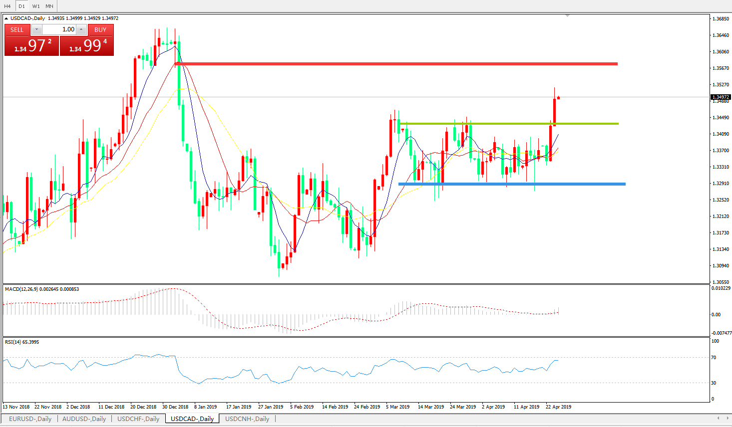 技术面简析:日线图均线有序多头排列,汇价上破重要压制快速拉升,MACD0轴附近拐头上行且动能柱快速放量,RSI快速走升,预计汇价大概率将进一步上行。