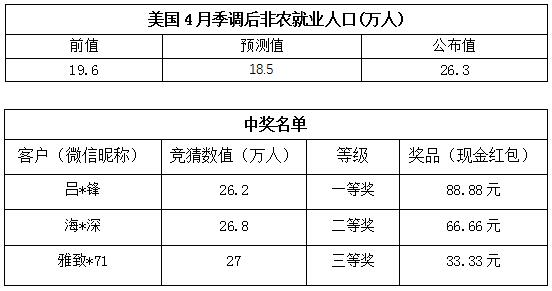 “4月份非农就业人数大竞猜”活动的中奖结果已出,获奖信息如下: