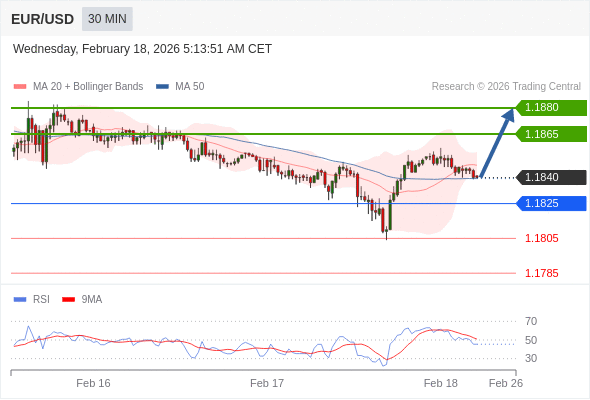 在 1.1825 之上,看涨,目标价位为 1.1865 ,然后为 1.1880 。