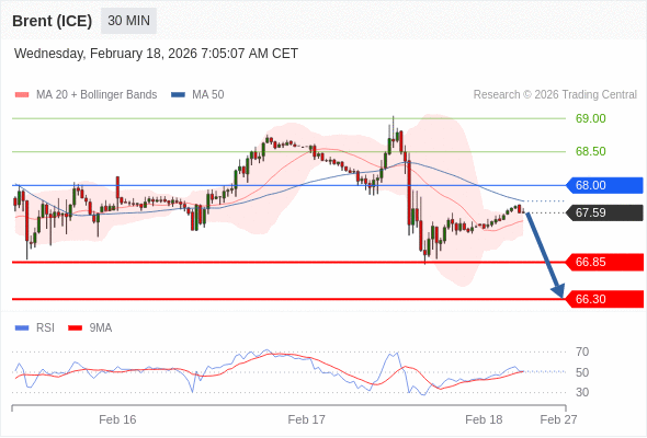 交易策略: 在 68.00 之下,看跌,目标价位为 66.85 ,然后为 66.30 。