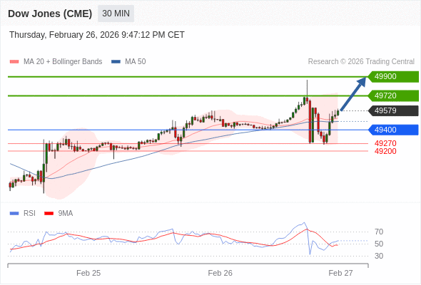 在 49400 之上,看涨,目标价位为 49720 ,然后为 49900 。