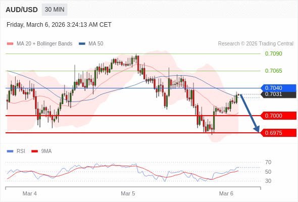 在 0.7040 之下,看跌,目标价位为 0.7000 ,然后为 0.6975 。