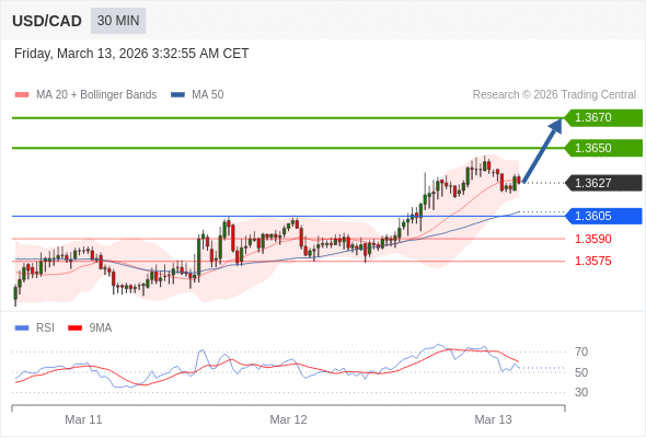 在 1.3605 之上,看涨,目标价位为 1.3650 ,然后为 1.3670 。