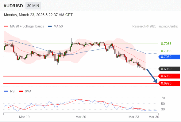 在 0.7030 之下,看跌,目标价位为 0.6950 ,然后为 0.6920 。