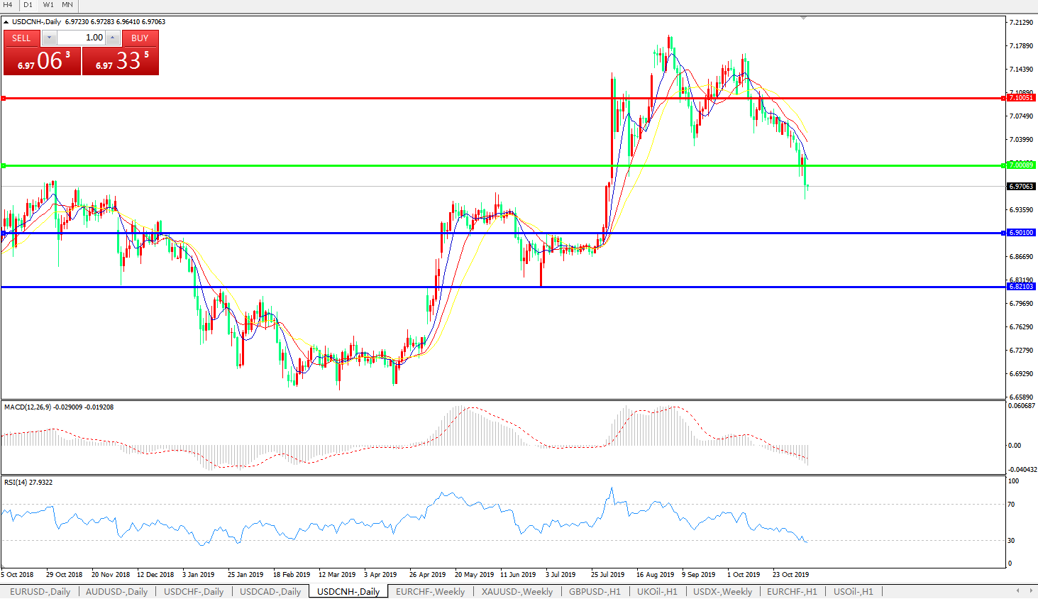 交易策略: 在7.0000之下,看跌,目标价位为6.9010,然后为6.8210。