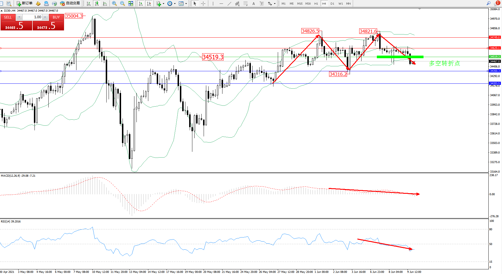 交易策略:34519下方看跌,目标34350、34203