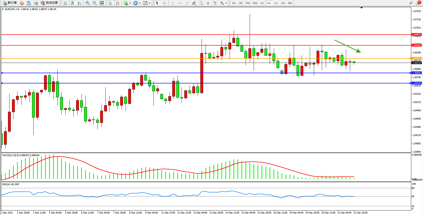 欧元美元EURUSD—4小时K线图显示: