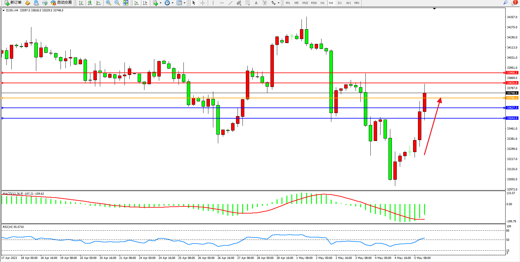 道琼斯指数DJ30——4小时K线图显示: